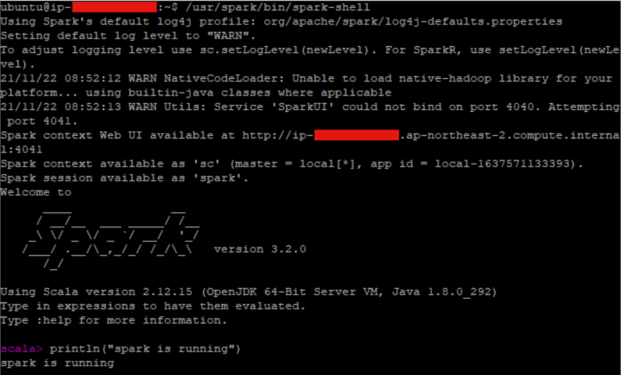 $ /usr/spark/bin/spark-shell println("spark is running")