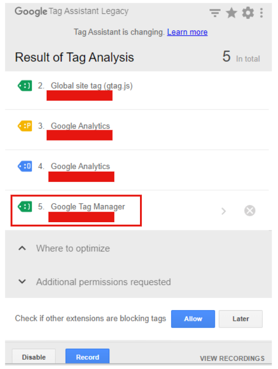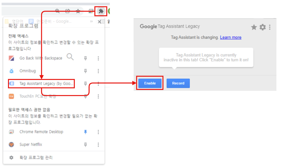 아래 그림처럼 Enable 까지 클릭해주면 아무것도 아무것도 안뜰것이다. 그럼 새로고침을 누르고 다시 Tag Assistant 눌러주면