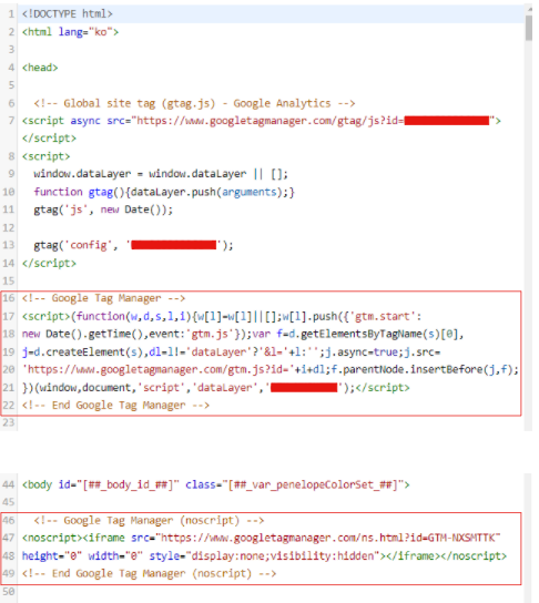 이 비슷한걸 봤을것이다. GA 계정 만들떄 나온 추적코드랑 비슷하다. 이코드도 마찬가지로 데이터를 수집하고자 하는 사이트 상단에 추가해줘야 한다. 그런데 코드가 2개이다 아래코드는 위에 코드가 오류가나서 수집이 안되었을때 아래 코드로 수집을 실행한다 라고 이해해주자. 그래서 코드를 <head>와<body>에 상단에 하나씩 추가해주면 된다.